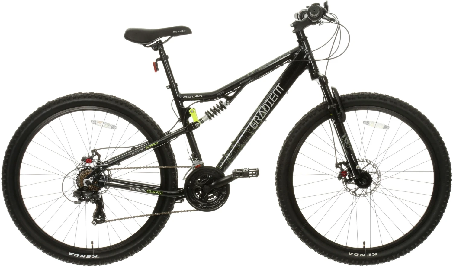 The Apollo Gradient Mens Mountain Bike is designed specifically for the thrill seeker. With 21 Speed Shimano revoshift gearing and full suspension you can attack those trails at speed, and with mechanical disc brakes and light alloy wheels the excitement and fun is backed up by great braking power!