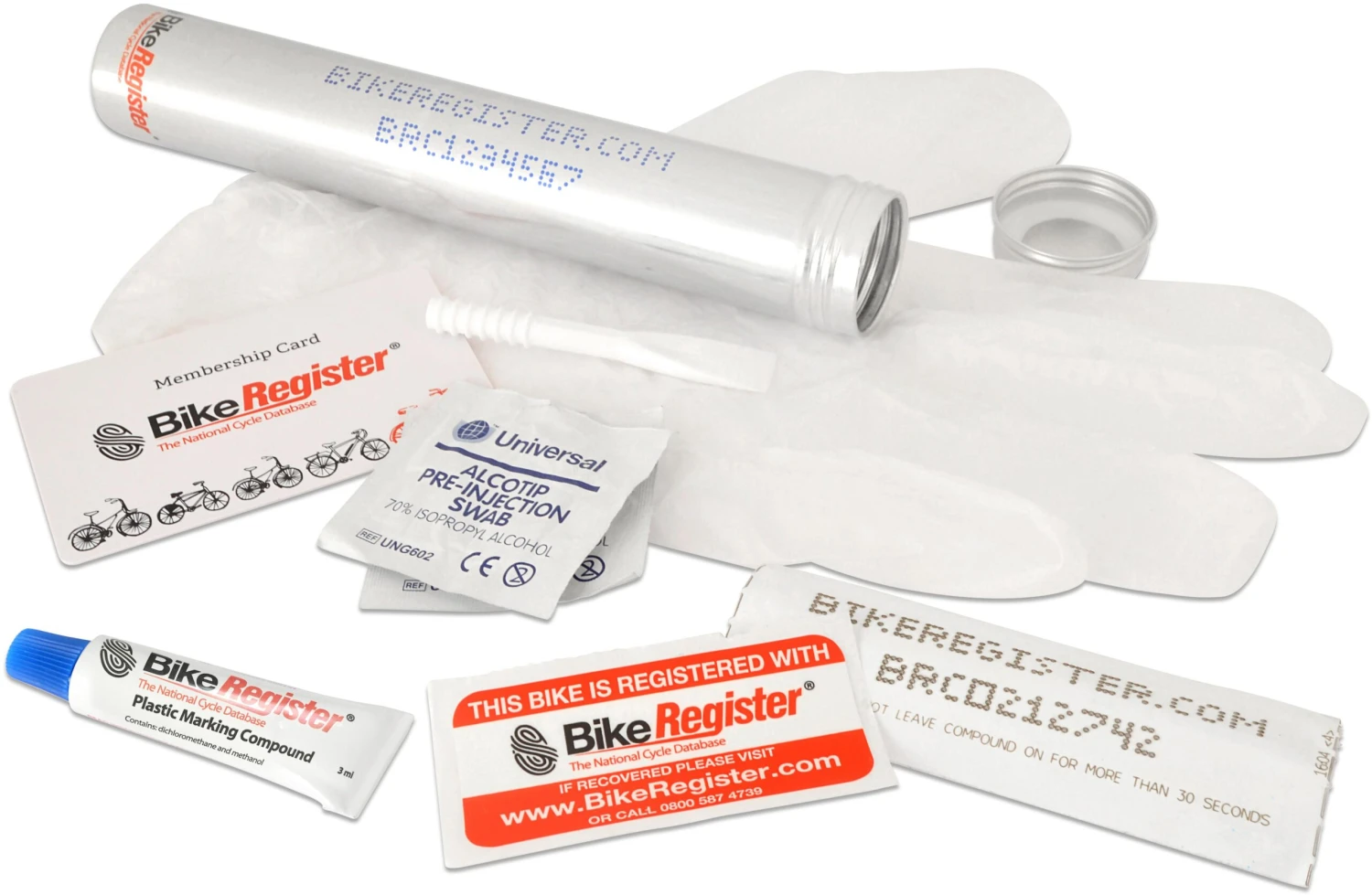 - DIY kit that etches your BikeRegister ID into your bike's frame Includes a durable, tamper resistant warning label which deters thieves