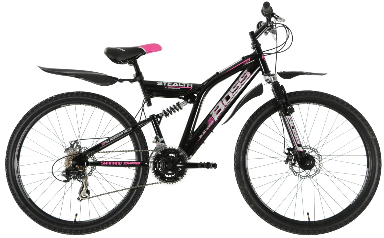 The powerful looking Boss Stealth Women's Mountain Bike takes no prisoners. Its strong design is matched with impressive specs which will make light work of off-road trails. 21 speed Shimano gearing equals power, mechanical disc brakes are reliable, and full suspension gives you a comfy ride on uneven terrain.