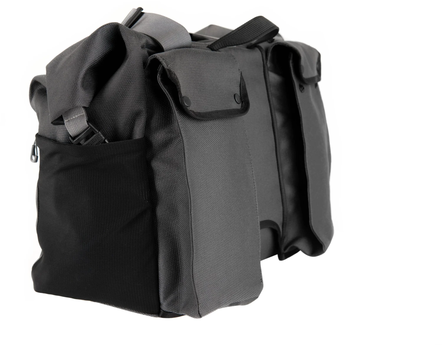 Bags of room. The largest bag in the range, a classic roll top, with multiple storage compartments ready for serious commutes and multiday trips. This highly water resistant bag features an adjustable external load carry strap (making for easy access to helmets or jackets), integrated water bottle sleeve and padded laptop section. Made with a tough textured Cordura fabric and stretch mesh for the expandable side pockets, this bag packs-it-all in, day in, day out.