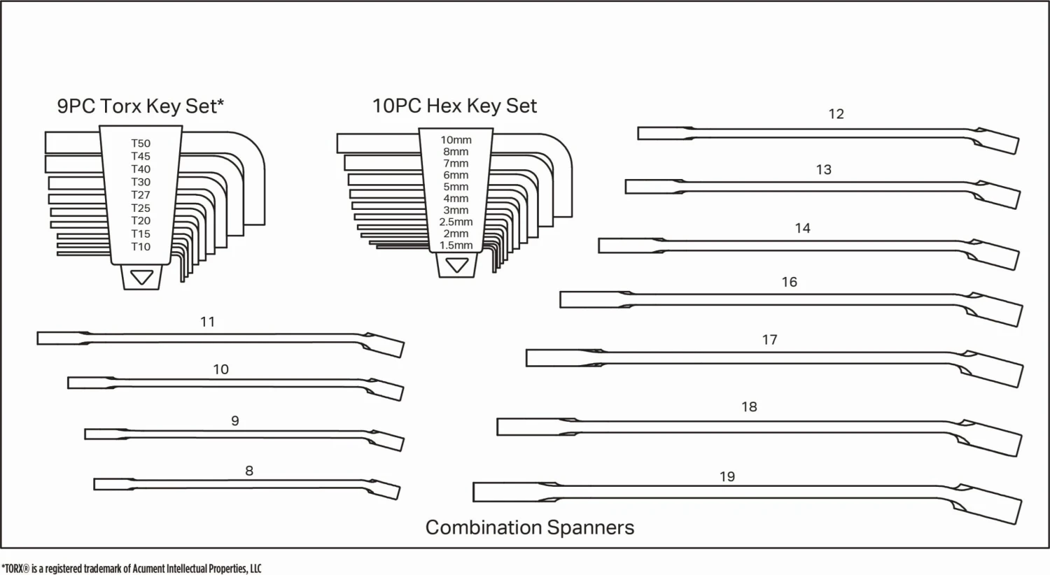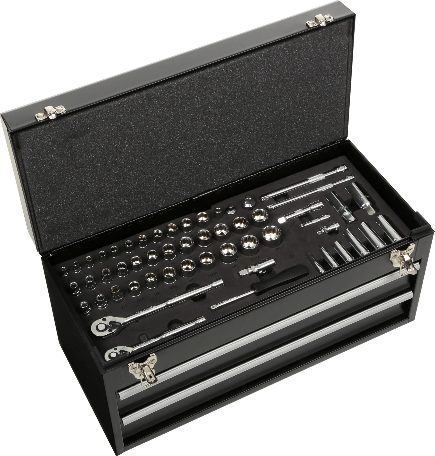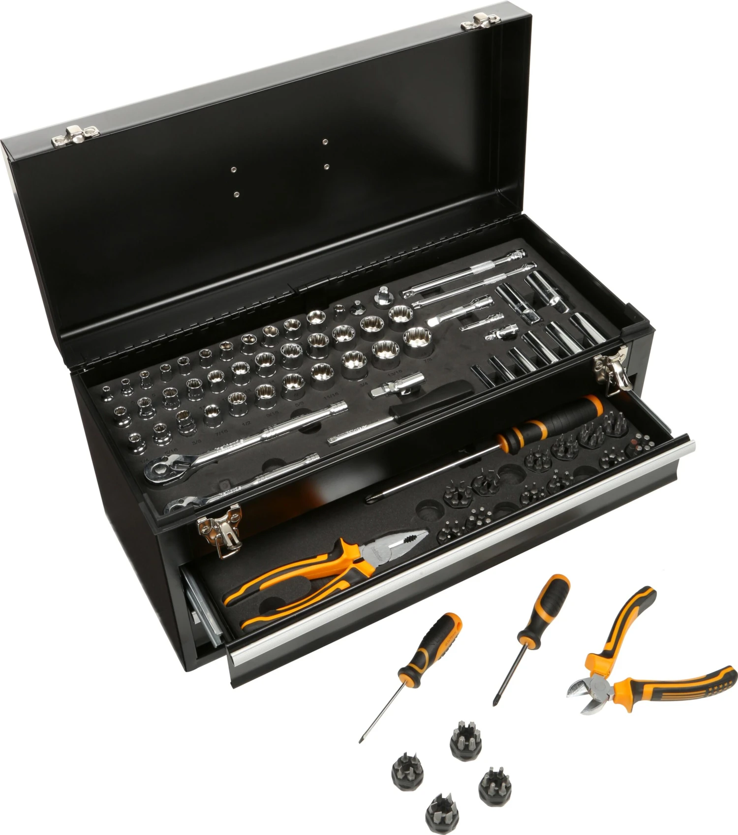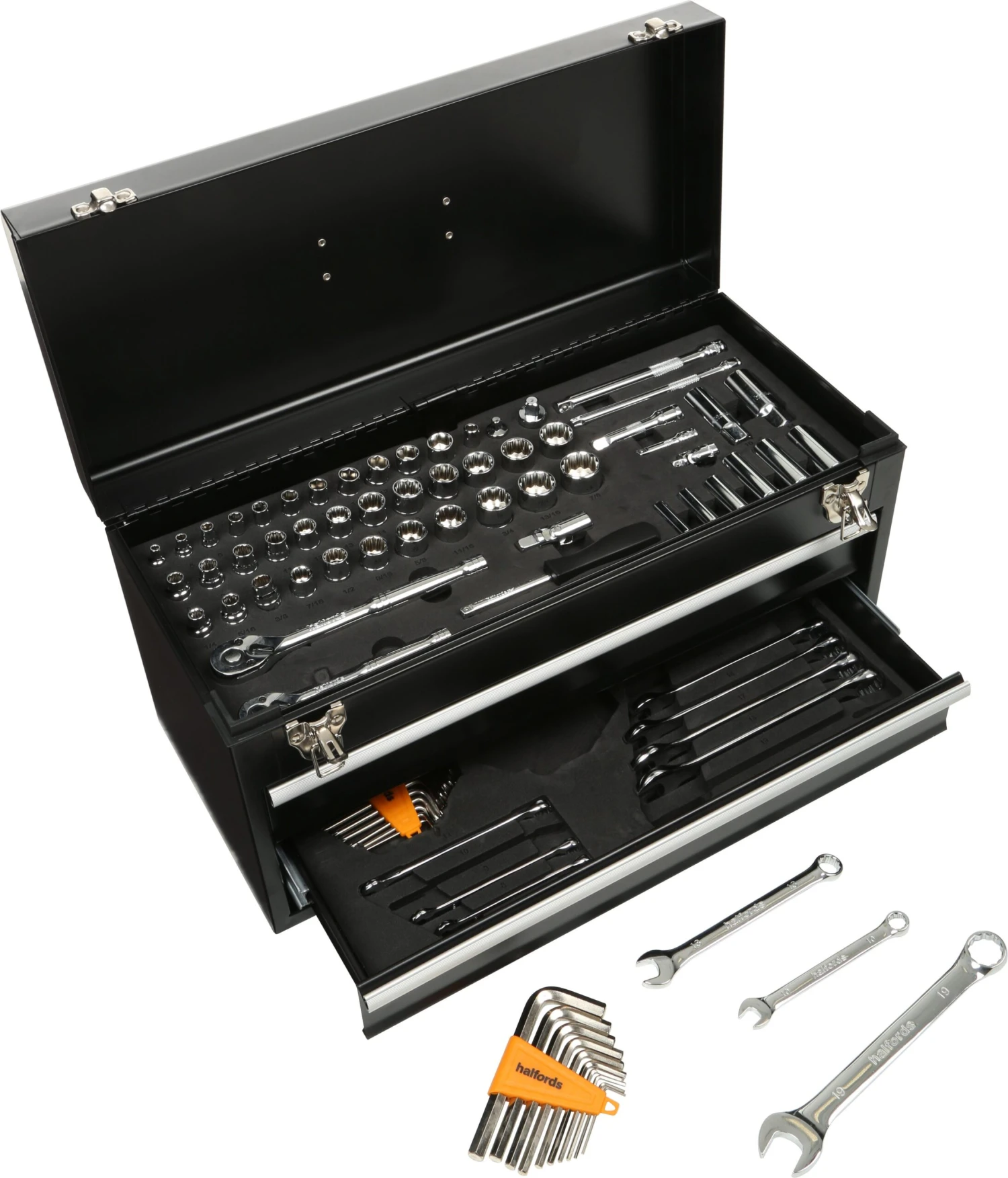 A range of other tools such as combination spanners, pliers, screwdrivers, and hex and torx keys make this set an ideal solution for anyone looking to complete jobs on their vehicle, as well as around the garage and home. The 186 tools are laid out in EVA foam so you can easily find what you need and housed in a two-drawer tool chest for safe, easy storage.