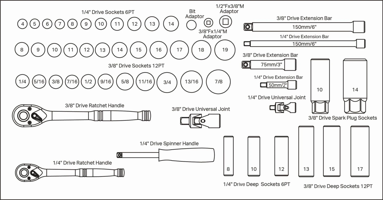 - 12-point standard sockets (from 4 to 19mm)