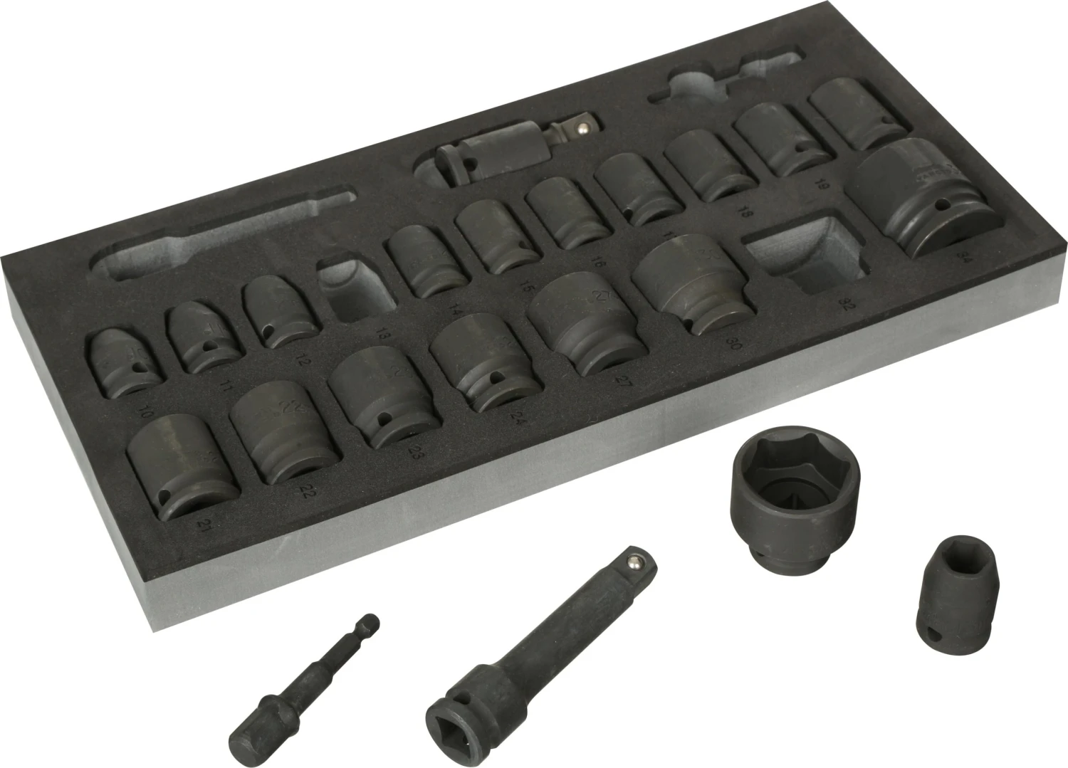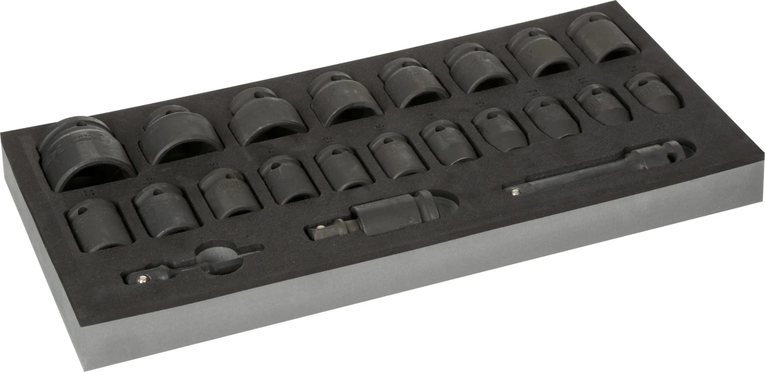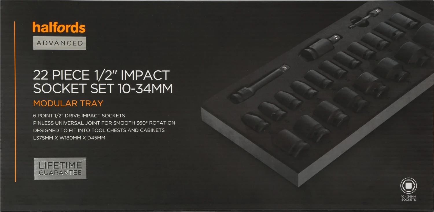The ideal set to complement your impact wrench, the Halfords Advanced 22 Piece 1/2″ Impact Socket Set Modular Tray has a wide range of impact sockets up to 34mm in size. The set includes a socket adaptor for easy use with power tools, as well as an extension bar for easy access in confined spaces.