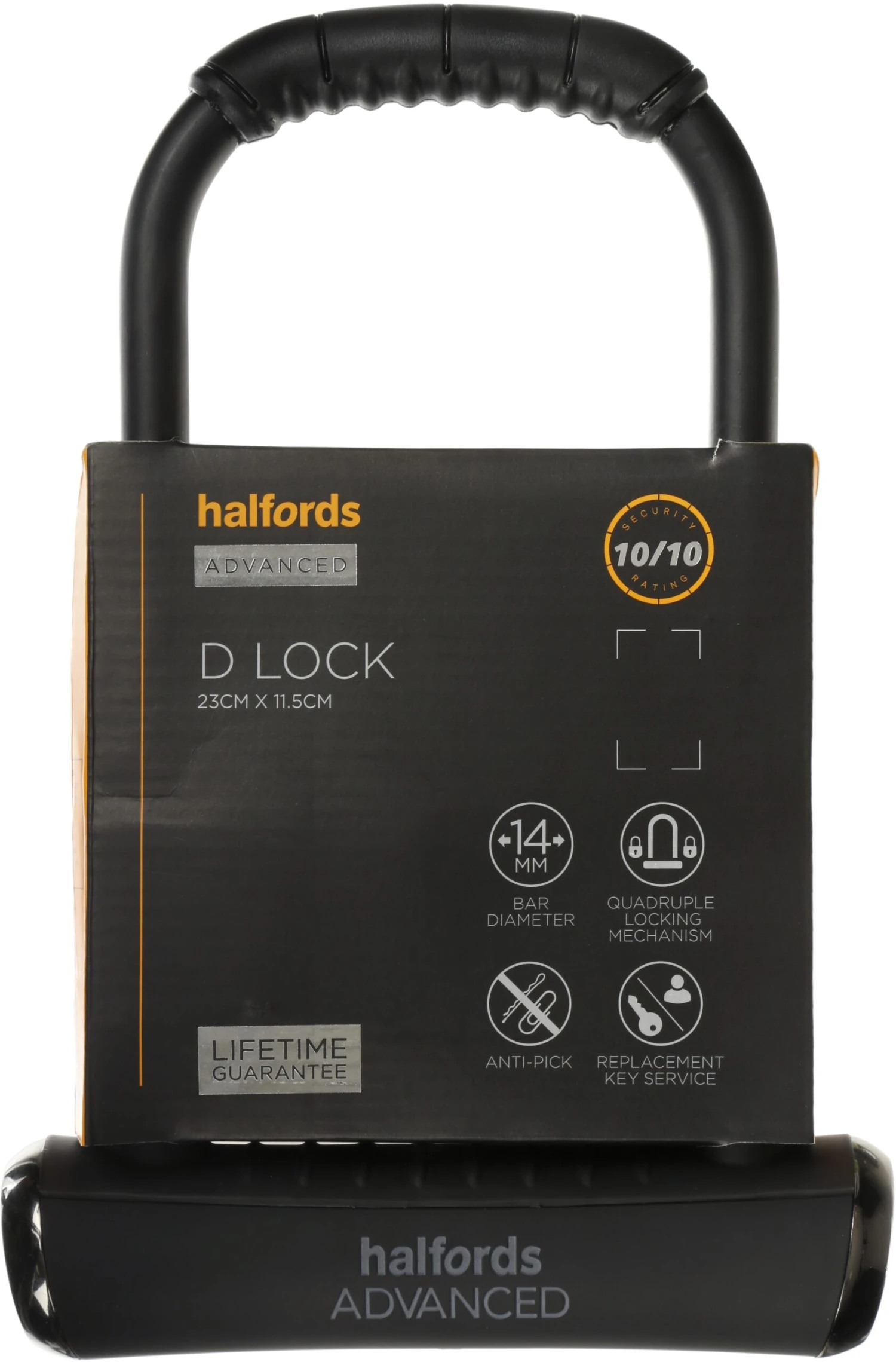 The Halfords Advanced 23cm D Lock is our first 10/10 rated lock. Featuring hardned steel casing to protect against drill attacks, anti pick locking mechanisms and ultra hardened steel shackle. This lock is designed to fight against prying, jacking and cutting attacks.