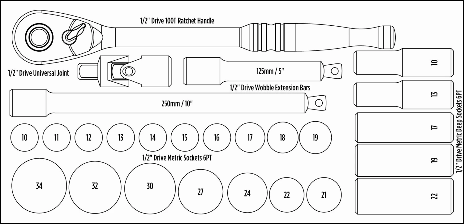 The Halfords Advanced 26 Piece 1/2″ Socket Set Modular Tray provides a lower swing arc, which means you need just 3.6 degrees of movement before the next tooth is engaged. Combined with the low-profile head design, this makes it the perfect choice for working in confined spaces. The longer handle gives you better access and increased leverage, and the quick release button allows sockets to be easily detached.