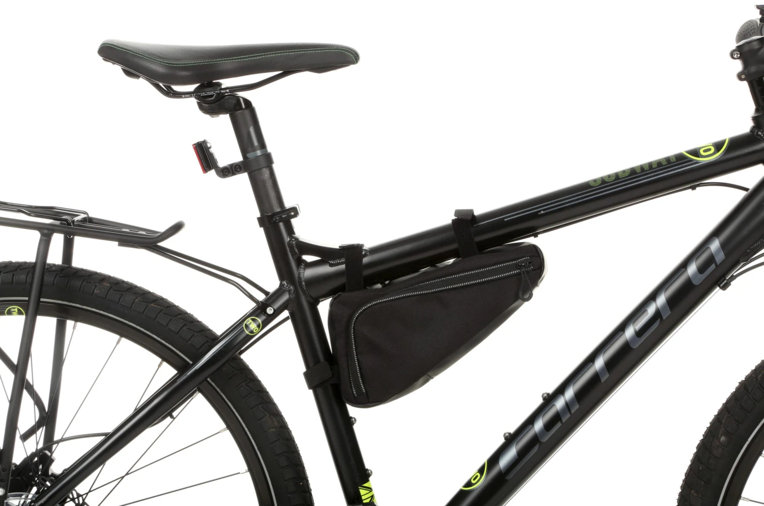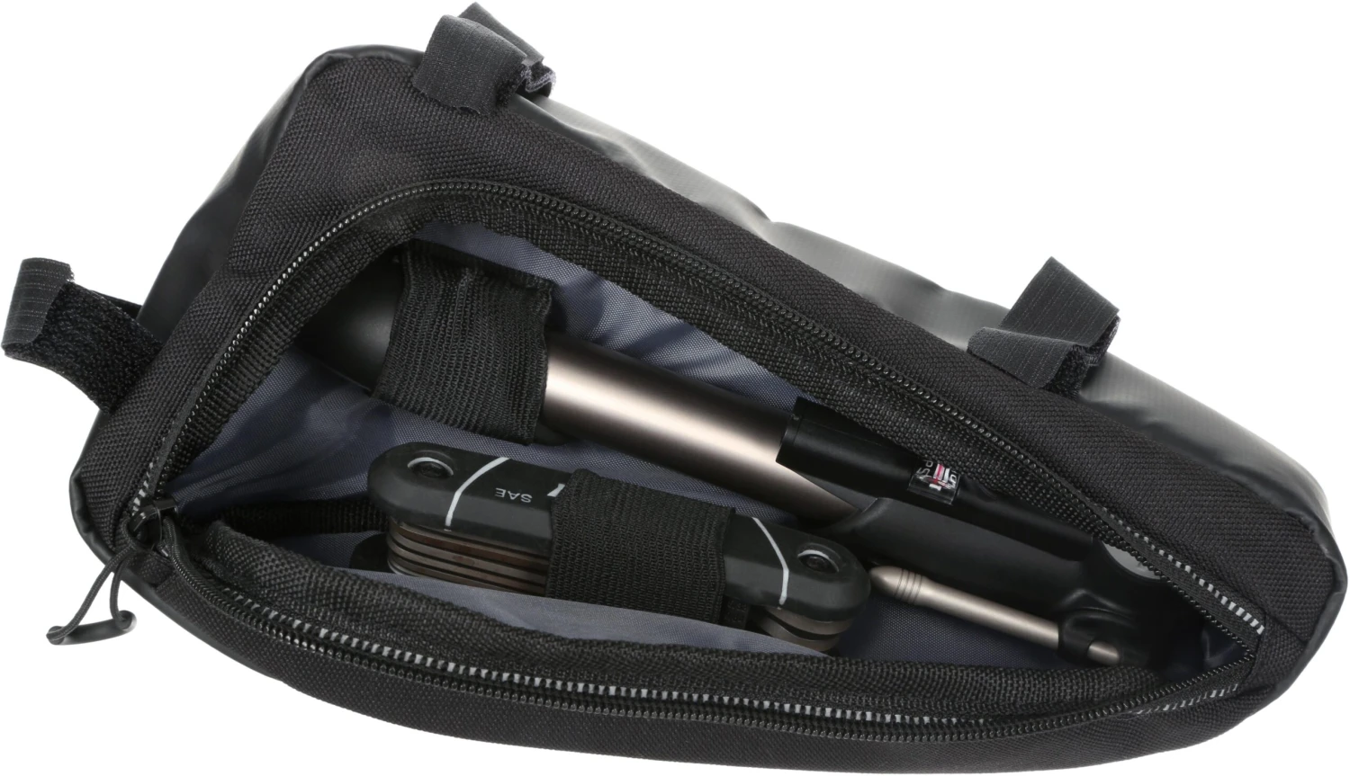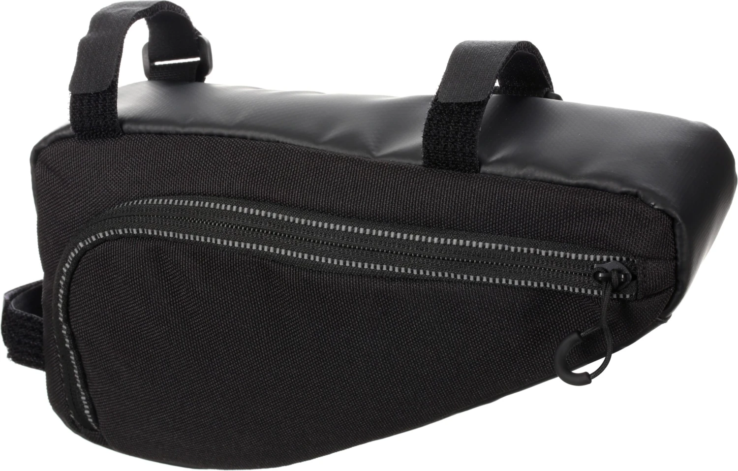 The Halfords Frame Bag features a water repellent base fabric for protection against road spray, and a universal strap fitting allowing the bag to attach to various types of bike frame. Featuring one main compartment with internal straps, you can secure a number of accessories such as a hand pump and tyre levers. A second external zipped compartment can be found on the other side for storing smaller items. Cleverly positioned reflective trims around the zips will increase your side visibility at nighttime.