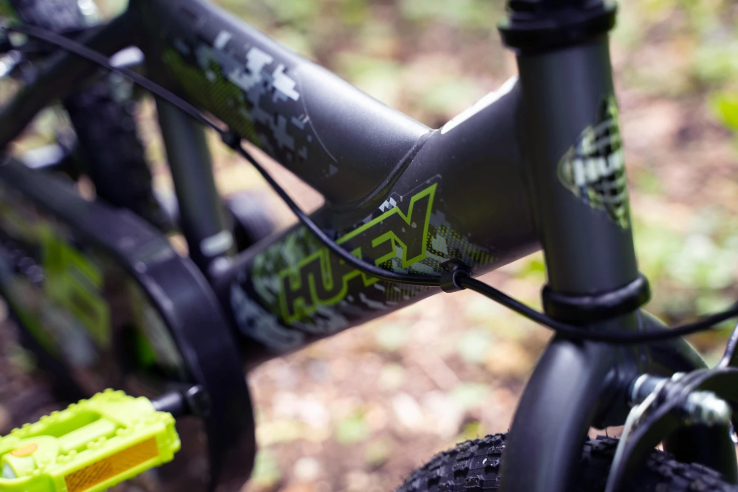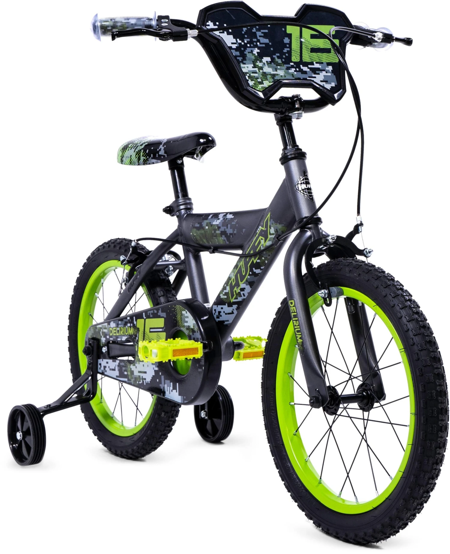 The Huffy Delirium 16″ has a cool, edgy style. The matt silver frame, black graphics and number 16 race plate demand attention and guarantee fun! Easy-to-use caliper brakes deliver solid control. Translucent grips reveal dual-color graphics underneath.