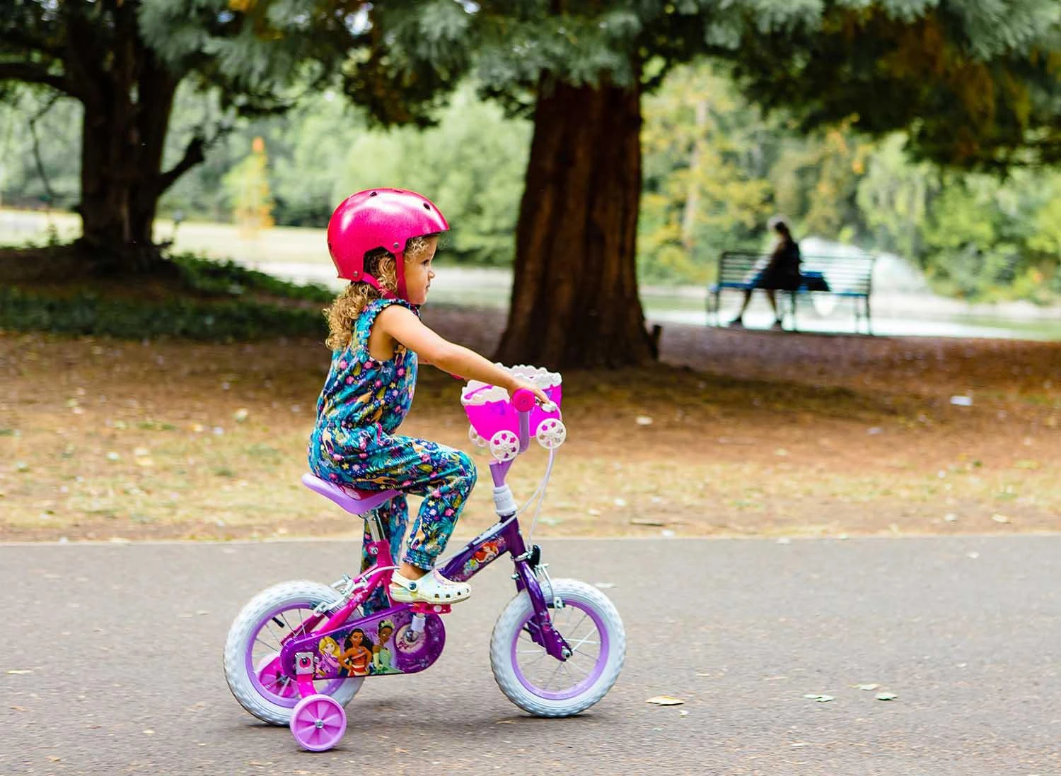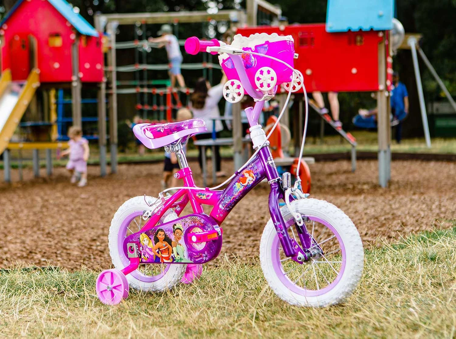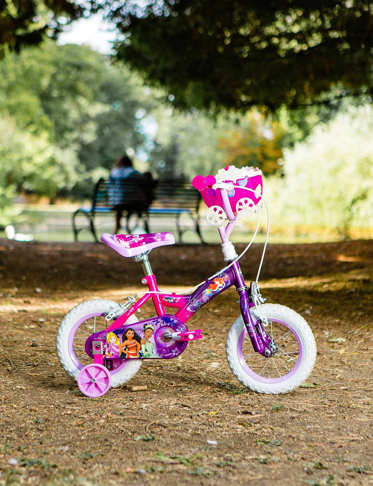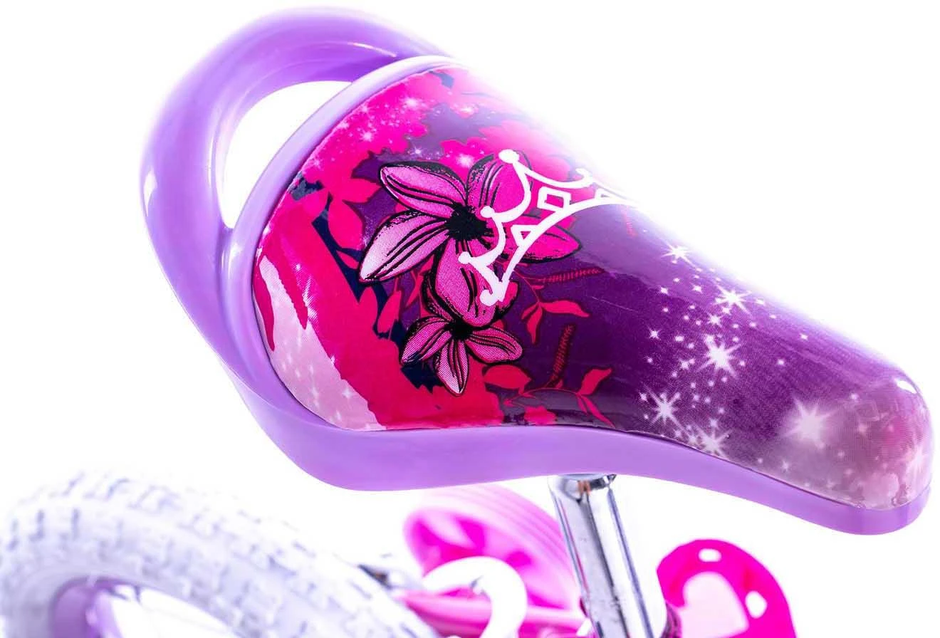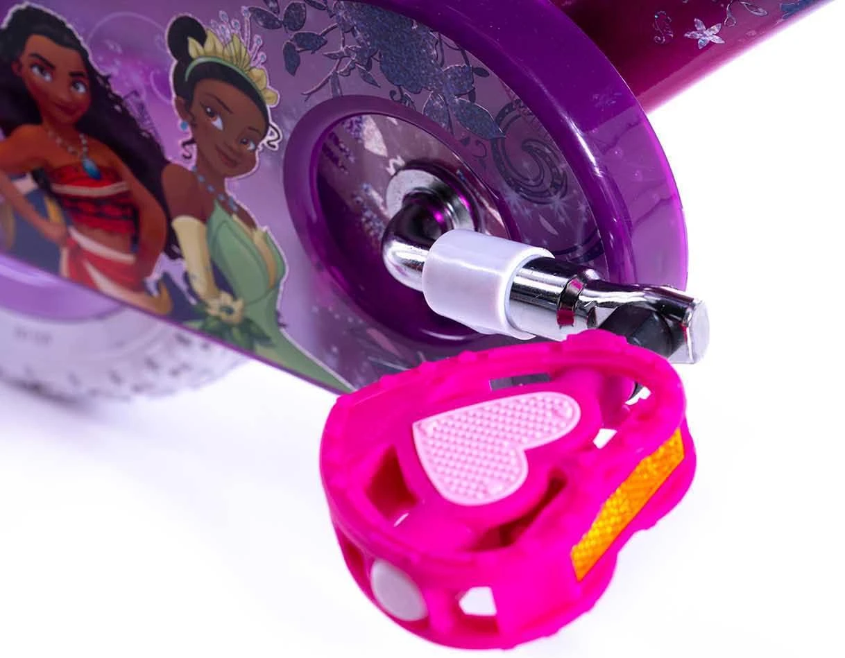 Dream Big Princess! Join Ariel, Jasmine, Belle, Tiana & Cinderella on the Official Disney Princess 12 Inch Girls bike. The perfect first pedal bike for kids starting out on their cycling adventures alongside her favourite Princesses on this stunning 12″ wheel bike. Finished in stunning pink and purple and unique Disney Princess graphics, complete with a Princess handlebar carriage for her favourite toys, this bike is the ideal first bike for children learning to ride with pedals.