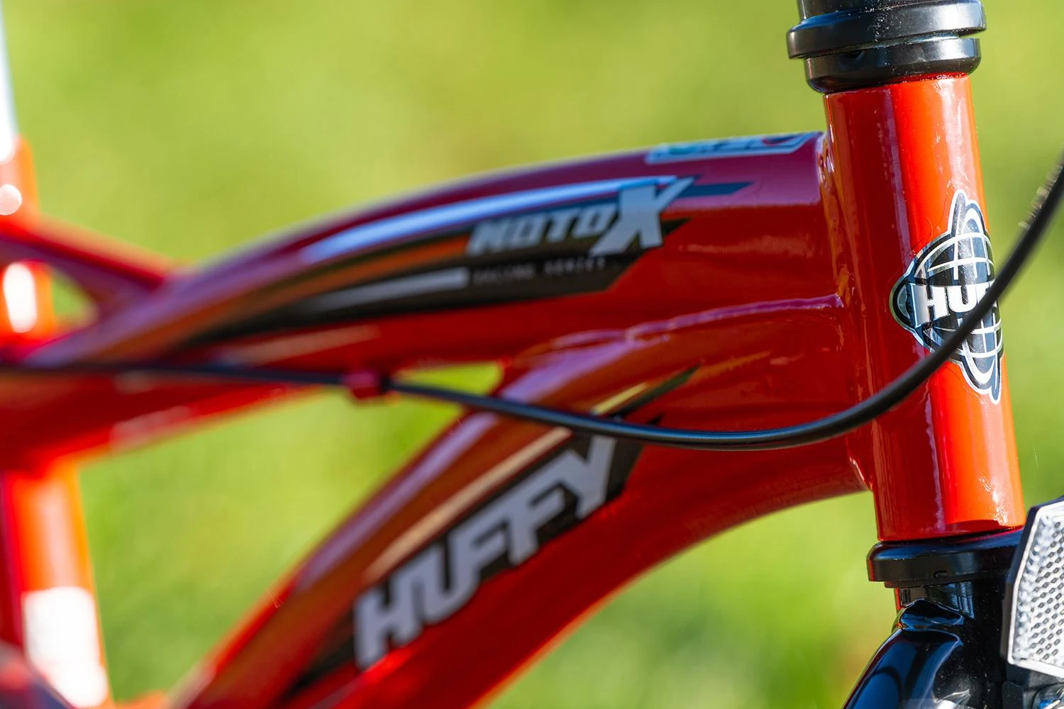 Bright colours and cool graphics, the BMX inspired Moto X bike has what you need for miles of memories. The durable steel bike frame in red comes with bold, rugged tyres on black rims. The 12″ Moto X Kids Bike includes a padded seat that’s adjustable for the right fit. A fun ride with a striking look! Quick & easy assembly, the Huffy Moto X range of bikes all come in our now famous Quick Connect format, making kids bike assembly fast and easy.