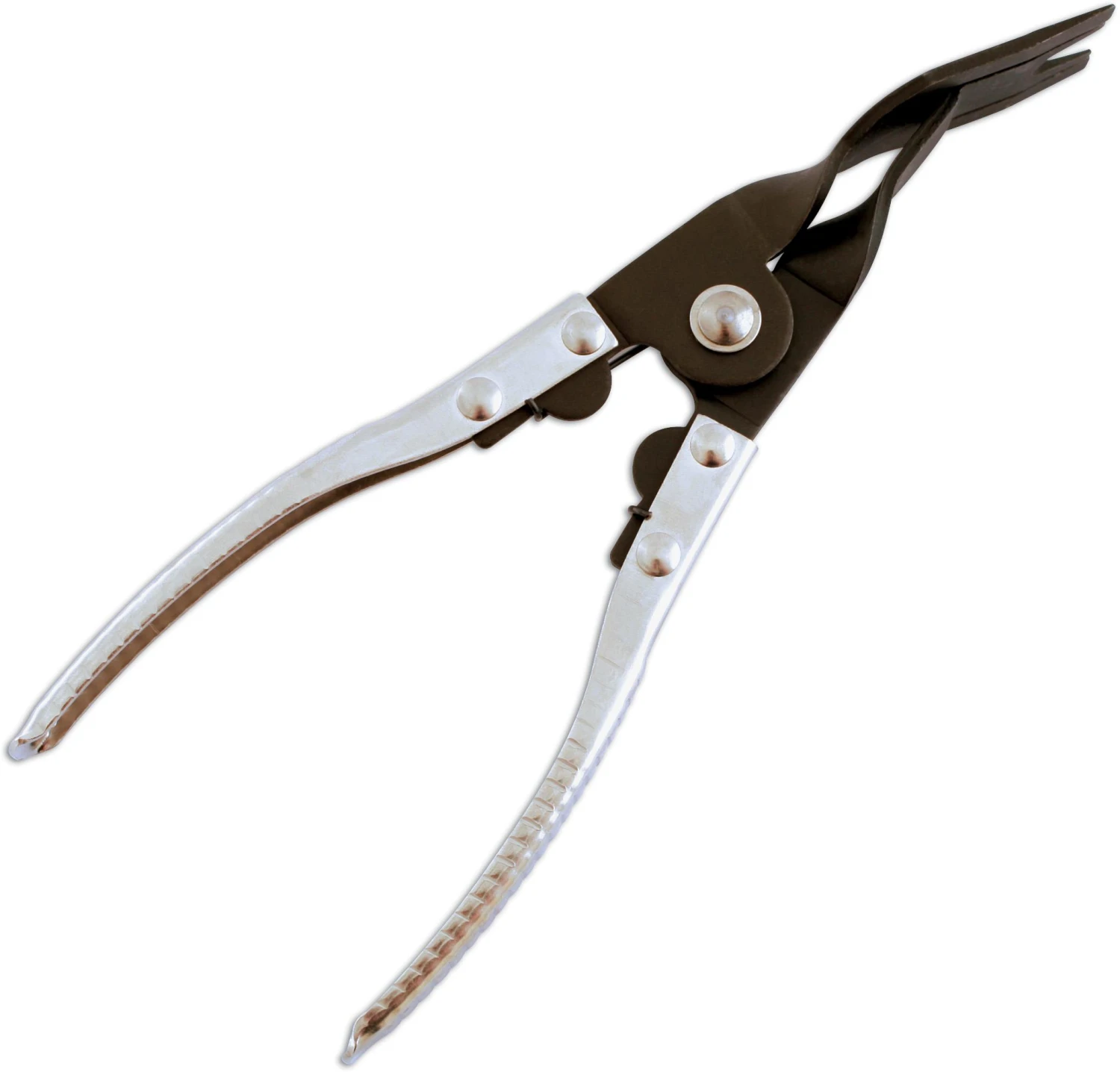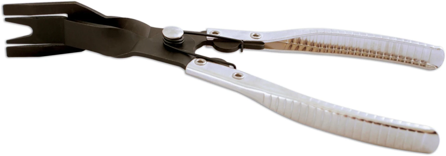 Trim clip removal pliers for the quick, easy and safe removal of trim clips without causing damage to the trim.