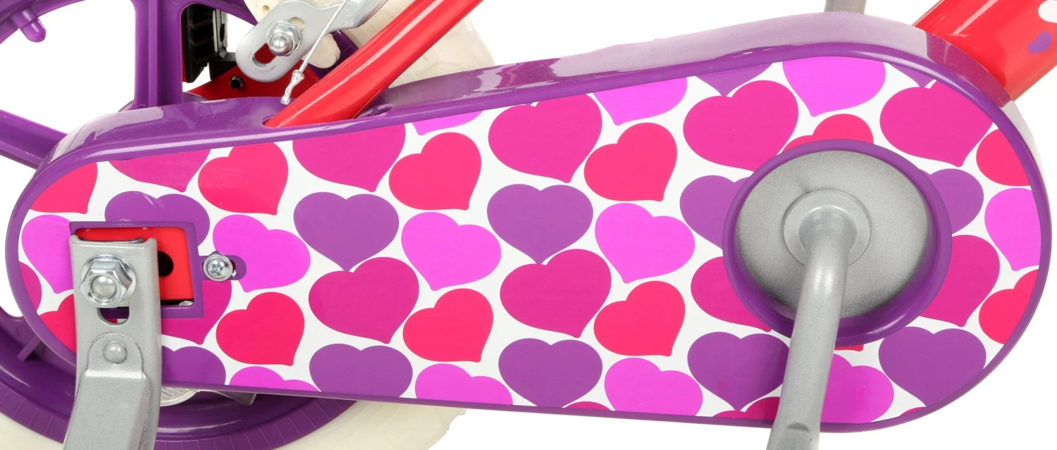 They’ll also fall in love with the fun colours and heart decals that adorn the frame and full chain guard, which keeps hands and clothing away from moving parts.
